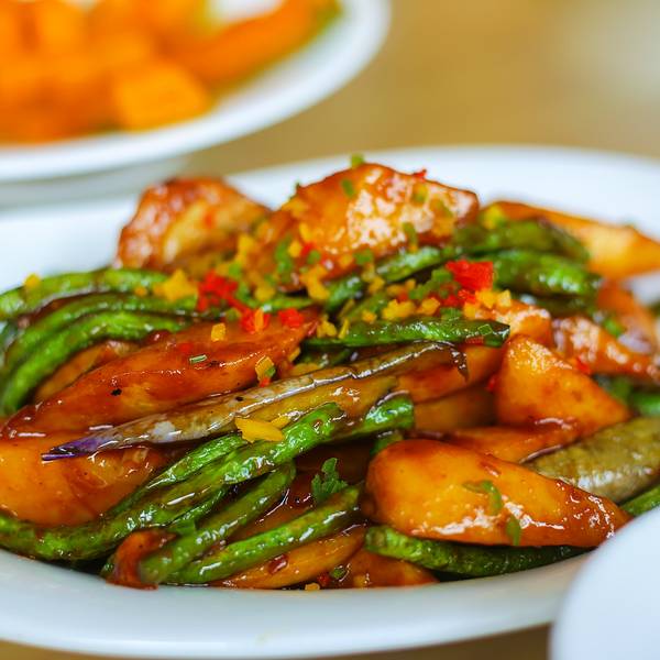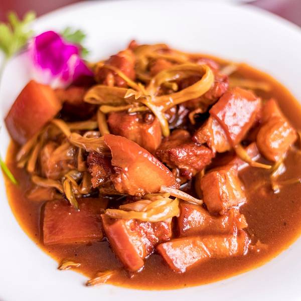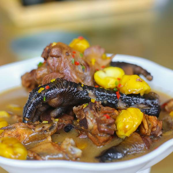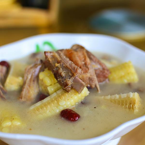 中午时分在山上的玉津坊吃午餐,据说去年夏天,这家店还有个名字叫做“深夜食堂”,是因为去年暑期蒙山坐了一场山顶露营的活动,晚上可以追星星,清晨可以看日出,而大本营就是在玉津坊。每年盛夏蒙山都会举办伏羊节,虽说是九月份,我们在山顶也吃到了来自蒙山山羊的味道,餐厅还在羊汤中加入了今年新种植的玉米,一来用玉米吸收了汤中多余的油脂,二来使得玉米也变得更香,羊肉本身膻味较小,肉质细腻。蒙山炖鸡作为蒙山特色三大美食之首,选用至少一年以上的农家散养公鸡,慢火炖制,其中加入独门秘方底料,其中还包括几味中草药,一来为了更好的入味,二来对食客来说也更加健康。上桌后底汤浓郁黄里透红,每一块鸡肉吃起来都肉质细嫩,与市面上的普通速成鸡毫无可比性。这个时节有很多大厨喜欢将秋收饱满的板栗放入锅中一起煮,味道更佳。“煎饼卷大葱,好吃、美味”这是90年代电视剧《宰相刘罗锅》里的一句经典台词,作为山东最传统、最地道的美食,或许很多外地人是吃不惯煎饼和生葱的,但就是这两样的完美结合,再加上传统的大酱,送入口中碰撞出的美味或许只有吃过才能体会到。为了照顾外地人的口味,现在很多餐厅都有所改良,比如添加生菜、芝麻盐等,为的是中合大葱的辛辣味,让每一位食客都能体验山东必吃美食——煎饼卷大葱。红烧肉做的也是很地道的,带皮的五花肉肥瘦相间,肉质松散有弹性,光是看这色泽就相当有食欲。菜豆腐,当地的方言叫做“渣豆腐”,即我们平时磨豆浆剩下的豆腐渣,与切碎的蔬菜混合,经过一定的烹制,做出的一道豆制品素食,口味是很清淡的,想着做法不难,回家那天喝豆浆,也想自己尝试做一把。土豆、长豆角、茄子,都是周边农户自家种植的无公害蔬菜,用最传统的蔬菜烹饪最传统的味道,不需要过多的调味品,更健康,口味也更棒。同样是在这个丰收的金秋时节,农家自种的南瓜,最简单的做法便是蒸,口感绵软而且甜度很高,即当菜又可当做主食。