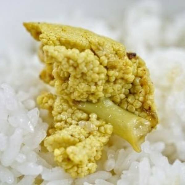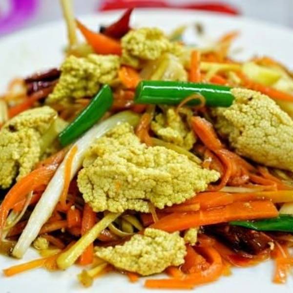 云南的野生植物种类超多,于是可用于食用的植物也是稀奇古怪的,而腾冲这便是有一味叫做棕包的特色~ 于棕树之上,枝叶与树干连接之处常常长有花苞,花苞慢慢生成花束,吊着大量金黄色小米般大小的棕树花穗~ 而棕包就是在花束长出之前,就将其割下,再层层剥开,藏在最里层含苞未露的嫩花穗~ 棕包通常配以炒肉,也可与胡萝卜丝,榨菜丝,香葱等炒成素菜~ 这不,在他们家就因为多问了一句,是否有素菜吃法?于是同样的价格晕菜变素菜了~ 不过素炒的榨菜微咸,胡萝卜清甜,棕花清苦,在干辣椒与油香参与之下融合,不强烈的咸甜辣香之后,而又生津回甘,这味道还是不错的~ 就不和老板计较了~ 棕花的形态与口感都超级像鱼籽的,虽然味道大相径庭~