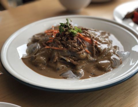 关东小磨东北菜的环境挺好的,中午去的时候人也不是很多,喜欢这里的招牌东北大拉皮,酱料很足,味道很棒,大拉皮非常爽滑,水饺也是特色,但是味道一般,锅包肉我挺喜欢的,表皮脆脆的,甜酸口味,里面的肉白花...