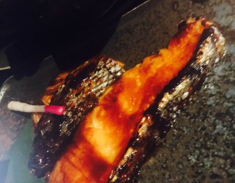 - 厚切三文鱼,没有那么厚,可能因为先吃了寿司和牛舌,味道有点怪,只吃了2片,实在不想吃了