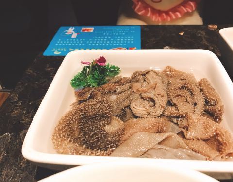 海底捞火锅,一直是火锅业乃至餐饮业界服务态度的标杆。经过朋友推荐,我很任性的一个人去了镇江的这家店吃海底捞,这也是我第一次去吃海底捞。运气比较好,去的时候不用排队,到了就可以入住了。海底捞的服务绝对是一流,相信大家都有看到,门口排队的时候还可以免费做指甲。这家店的装修比较一般和其他地方的火锅店比起来并没有特别的好。听说我一个人来,服务员给我对面拿来了一只小熊,让我在对面感受他深深的敌意。 因为一个人吃,就点了1个牛油锅。服务员很热心的给我拿来了擦手机的布,包手机的袋子和一个围兜。因为菜品可以点半份,我点了我喜欢的菜,各半份。菜一上来我就傻眼了,半份居然有这么多,我怎么吃得完。 牛羊肉,据说是经过了3天腌制,在锅里一涮,口感鲜嫩。服务员会热情的在一旁提醒涮菜的时间。 黄喉,涮个两三分钟,口感爽脆,吃的出来,这个黄喉泡水的时间不算太长,个人还是比较稍微泡长一点的。 鸭肠和毛肚基本上在水里七上八下就好了,很新鲜很脆。 这个火锅其实也没什么特别好提的,感觉就是个普通的四川火锅,除了食材新鲜了点。但是这里的服务却让人印象深刻,服务员一直在旁边伺候,帮忙加水加饮料,这里的饮料是5块钱任喝的,非常划算。见我吃不得辣还征求我意见给我调制了解辣的油碟。还特地做了一份糖拌蕃茄送给我,特别温暖。海底捞的服务果然名不虚传,不过我觉得服务其实还是要有个度的,有些客人也许只是想静静的待一会儿吃个东西,你一直在旁边转就不太合适了,不过看在我离开的时候送的零食份上,原谅你了。推荐大家有时间一个人去吃吃海底捞,感觉也挺好的。