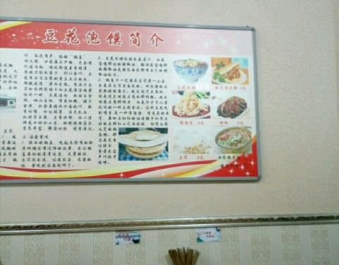 一,口味: 豆花泡馍:小碗,也是蛮大的一份。豆香浓郁,还放了花生碎,香菜,馍也煮得好。另外,有赠送小菜,是红萝卜丝与咸菜丝。 另外,店里还有凉皮,醋粉等,希望有机会再吃。 豆浆,有糖,可以自己加。 二,环境: 店里收拾得蛮干净的。虽然店不是很大,桌上配有调料。 三,服务: 老板与端饭的阿姨都很好,朴实。不错的店。
