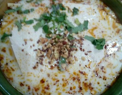 当地的一大特色啊!切片的锅盔在碗底,上面是豆花,加几根麻花,然后浇了浓浓的豆浆。再放黄豆、花生米等配料。豆花吃起来很嫩,但舀起来时也很有手感,不是想象中那种软软的感觉。口感不错哦!赞赞!