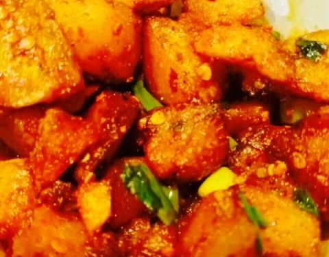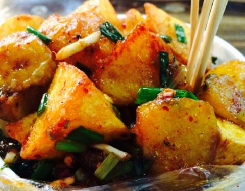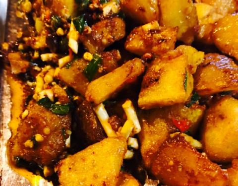 最美味的就是这个炸土豆坨坨,炸成金黄色,外表酥脆,里面很软,炸好后再拌成糖醋味,加了折耳根香香...