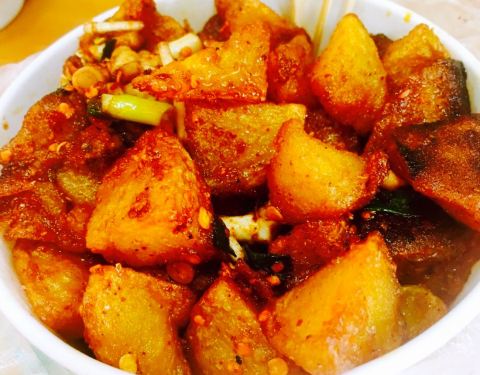 老板娘好配合,我们要拍照还专门把灯给我们开开??,说回洋芋,要了一份打包,老板娘又炸了下来拌,外面脆脆的,里边是面的,拌的味道也好,因此第二天又来店里吃了两份,撑死啊,店里吃的分量感觉比外卖足,推荐,下次还来。
