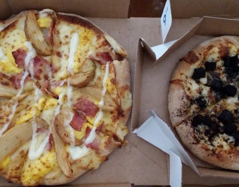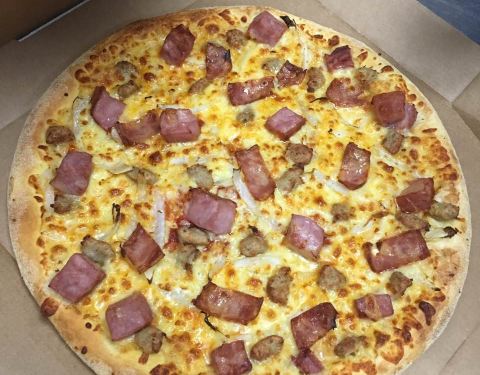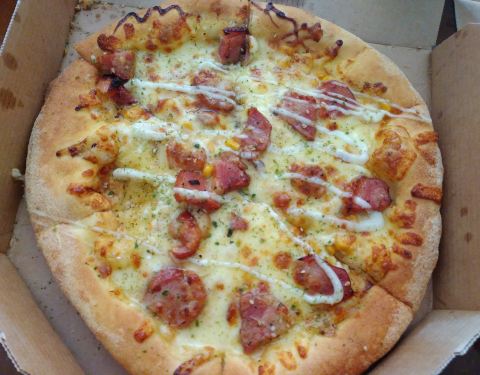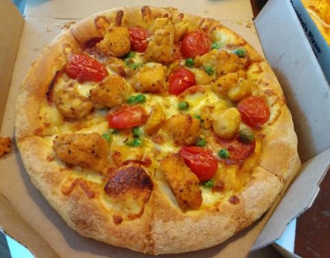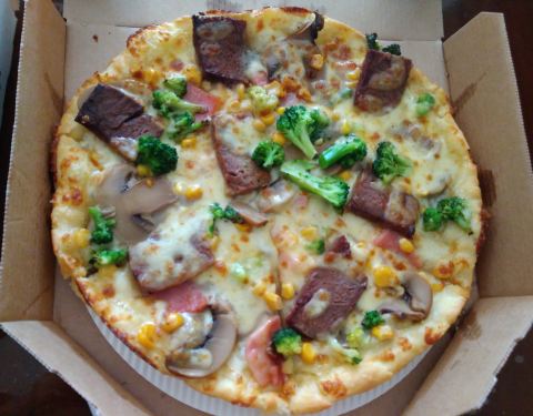 位于本市的一家达美乐比萨店,生意还是比较好的。这次叫了外卖来吃,点了买一送一活动的两个比萨:分别是:香甜菠萝双虾和大吉大利比萨两种,味道算是各有风味吧,这菠萝双虾比萨的口味是偏甜的,不仅菠萝甜,连大虾也是甜的。喜爱吃甜的朋友们别错过了。这大吉大利比萨的料是蛮多的,熏鸡肉、栗子、青豆、小番茄等等的美味都融合在了一起,吃上一口,真是倍觉满足,大快朵颐。 达美乐比萨店的各色Pizza真的是挺实惠的,价廉物美,味道也很好。