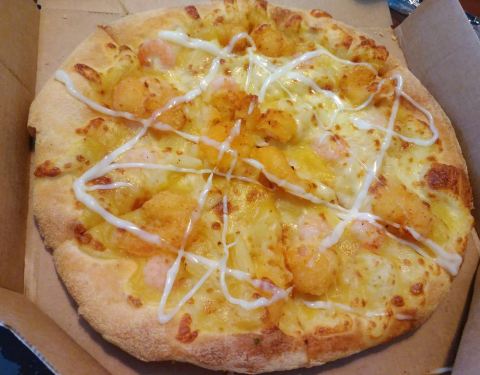 ...大吉大利比萨两种,味道算是各有风味吧,这菠萝双虾比萨的口味是偏甜的,不仅菠萝甜,连大虾也是甜的