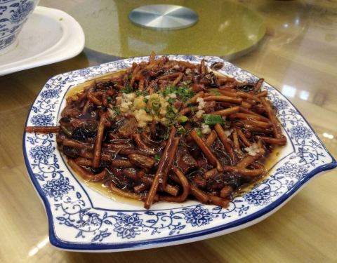 三林老街上的一家本帮菜馆,周末晚上去人不是很多。吃的都是本地人的老菜品。 本帮蒸三鲜老八样菜品之一,用肉皮垫底,再加以肉丸,咸肉,熏鱼等荤素食材上锅蒸制等以最大限度的让食材的美味全部进入汤中,而这个汤里没有加一点调味品。 野茭白炒蛋 也是本地人只能中很有特色的一道时令菜,选取自然生长的茭白,选其中最嫩的部分与蛋液滑炒,非常好吃。
