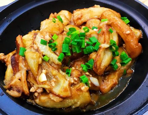 到了阳江的海陵岛,晚上到酒店附近觅食,见到了这家新城渔邨(保利银滩店)。 据说这是一家老字号,门面和店面都很大,门口摆了不少海鲜和新鲜蔬菜,供顾客选择。 店面有三层,一楼是大厅还有鱼池。坐下后要服务员拿菜牌来,服务员明知我们不打算吃海鲜,还要我们去门外点海鲜。叫了几次才拿来菜谱。点菜以后又是漫长的等待。 【鱼香茄子煲】35元 用瓦煲上来,分量还行,茄子蛮香的,下饭不错。 【白切鸡】38元半只 鸡是现点现杀的,非常新鲜,鸡质还可以,皮爽肉嫩。 【咸鱿肉饼煲】48元 这是餐厅的招牌菜。我第一眼看到就想点,这是因为小时候亲戚从乡下带来自己腌制的咸鱿鱼,外婆就把咸鱿鱼和猪肉剁碎了,蒸成肉饼,特别好吃。结果菜上来了发现做法不同。餐厅把咸鱿鱼和五花肉剁碎了,用铁锅来啫,吃起来很香,比较咸。 埋单146元,人均消费不到50元。