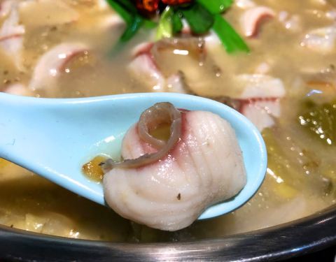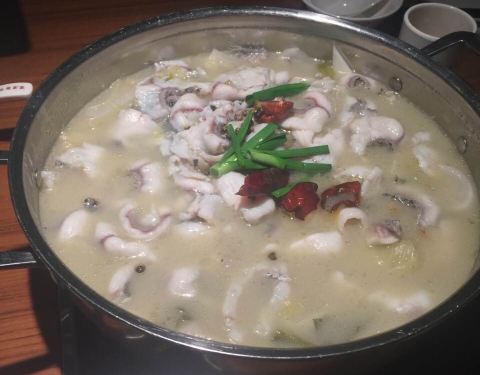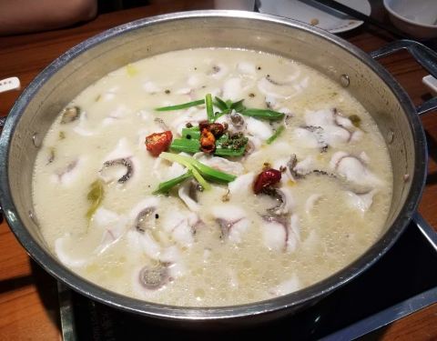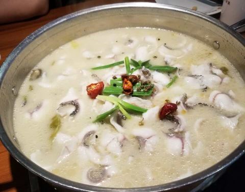 天气开始变热了,胃口也开始变差了,今天来点重口味的,看到这家酸菜鱼不错,来尝尝。可能是因为今天下雨所以人不是很多,小小的地方布置的倒是还行,就是座位太紧凑了,稍胖些的人坐下来有点不太适应。 因为有小朋友,不敢选太辣的,所以点的酸汤微辣的,坐定后店家还送来了小食,油炸炸的酥酥的黄豆,我不喜欢吃,太油,不过还是谢谢店家了。稍等了大约15分钟一锅鱼片就上来了,里面配以酸萝卜和宽粉,自己另加了几个涮菜,服务员很热情,告诉我们先吃鱼片吃完再涮锅。 清清爽爽的,黑鱼现杀,所以味道很鲜美,贵在新鲜,酸汤微辣小朋友完全适应,鱼片滑嫩几乎没有刺,所以吃着很不错,最后涮菜里的炸腐皮确实不错,中途看到我们骨碟装了一半骨头,服务员很主动的帮我换新,服务真的很勤快,而且还帮我们把涮菜锅里的浮沫给去掉,很用心的服务。 总结:人均差不多80左右,吃的很舒服,选料很好,食材都很新鲜,推荐!