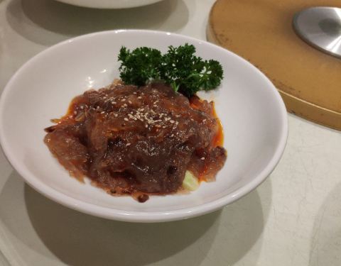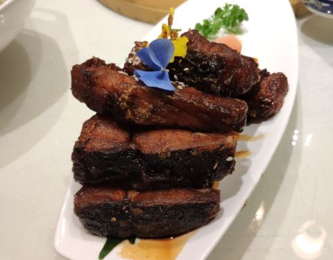 大宁的申宴酒楼生意一直都是那么的好,订小包房必须提前,当天去基本没有,二个大厅基本也是满座。未进门你就会看到一辆黄包车静静地守在门口,似乎是告诉客人这是一家传承上海菜的餐厅。今天点的一个菜一定要给好评,马桥豆腐烧竹筒骨,本来马桥豆腐就有一种豆腐特有的香味,再加上骨头的鲜味就更好吃了。