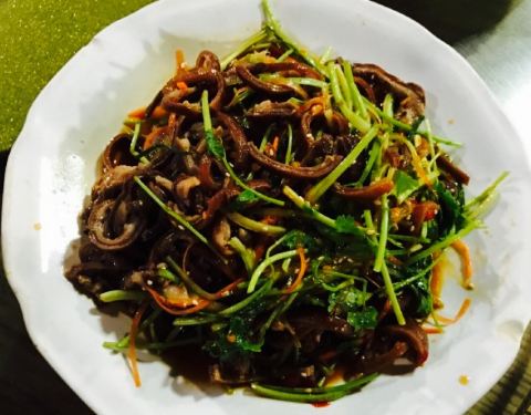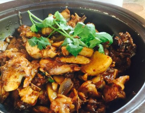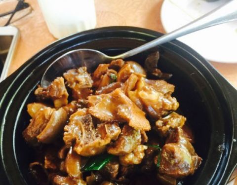 去云浮青山绿水温泉的中午来觅食,隔壁找网友攻略好的农庄吃饭,偶然找到沿线有间东成鸿泰山庄,于是沿着地图导航找到此处,虽然沿线有好几家吃农家菜的,但人气较旺的还是这间山庄。驱车前往,车辆都停在山庄后。山庄前有不小的池塘,附近绿树成荫,空气清新,看了餐牌,就是适合吃农家菜的山庄。看了网友攻略推荐,点了白切鸡,138元一只走地鸡是肯定要品尝的,号称7-8斤走地大扇鸡肉质肯定很好吃的,自己可以亲自到鸡笼挑选,到山庄吃饭,肯定要全程监督厨房整鸡,不然“偷龙转凤”给你小的鸡就吃亏了。等了大概45分钟,终于上来了,卖相很好,份量的确有介绍所说那么大,肉质爽嫩滑,沙姜酱油味道能带出白切鸡鸡味,很赞。另外点的上汤白菜和罗汉斋一般般吧,没有特别之处。