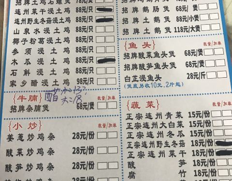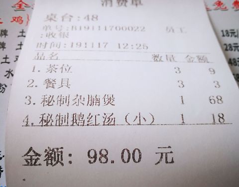 昌记土鸡店位于花都区凤凰南路1号,朋友带路过来吃午饭。 这是一家大排档,是一个用钢架搭建起的大棚,环境简陋,有大厅和房间。 #秘制鹅红汤#18元 上来很大的一盆,鹅红很多,很新鲜。 #秘制杂腩煲#68元 用瓦煲上来,稍微在炉子上热一下就可以吃了。里面的牛杂份量多,有牛肠、牛肚、牛筋等,味道有点辣,下饭正好。 这里的米饭免费任你自己盛,以不浪费为原则。茶位费3元一位,买单98元,人均消费约33元。