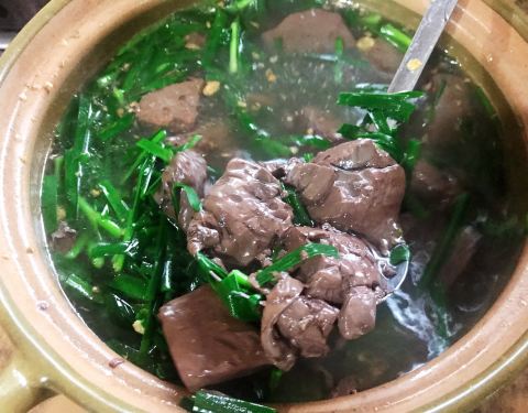 从白云国际机场出来,已到晚饭的时间。想起朋友推荐过花都的这家昌记土鸡店,于是驱车前往。 这是一家大排档,装修简陋。主打土鸡、鹅、鱼头、小炒等。这里是米饭和啤酒免费任吃任喝。 【招牌土鸡煲】上来一大煲,鸡肉结实,鸡味浓郁,非常嫩滑入味。汤汁下饭正好,淋在饭上,一大碗饭一下子一扫而空。 【秘制鹅红汤】里面的鹅血很多,非常新鲜。 茶位费要3元一位,餐具费1元,有点小贵。买单118元,人均消费约40元