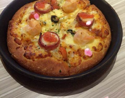 点了海鲜披萨,味道很好,没有普通装的,点了芝心的99元的那款~跟图片差不多,虾很大,味道挺好的~