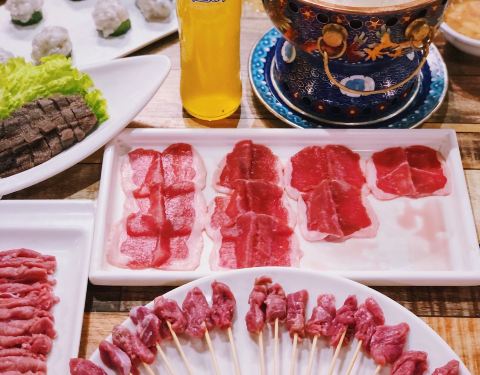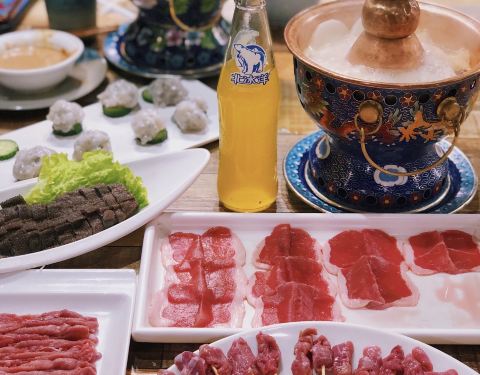 翻开相册乍一看 是属于周末的强烈饱腹感 这里是全上海肉肉密度最高的火锅店 中秋节贴秋膘怎能少得了南门涮肉❓ 传统清水锅涮出羊肉的原汁原味 大杂烩后的汤底真的是越煮越鲜♨️ 周末中午1点多食客依然络绎不绝,睡到自然醒后的我们如狼似虎大口吞肉,用满满一桌荤素搭配唤醒一整天的食欲,一开胃就停不下来。 精致小巧的羊瓜条串在小签签上,不禁联想起小时候弄堂边的羊肉串,那是最淳朴的记忆也是最深厚的情怀,抓起一把啃起来,油然而生满满的幸福感。 标志性笑脸的[愉快]老北京麻酱[愉快],堪称颜值担当非常适合拍照呢,☯️麻酱➕海鲜酱☯️可以尽享双味,咸淡适宜的调味配方保准让你一口接一口不忍停箸 除了品种丰富的牛羊肉,火锅配菜也有很多选择,青虾仁滑一份6只鲜嫩爽滑,而白萝卜、莴笋和油炸豆腐皮等配菜,养生时蔬越煮越入味。 吃累了不妨喝几口热气腾腾的内蒙奶茶,优雅茶壶扑面而来草原风情,搭配一盘红糖糍粑又能分分钟开启猪猪女孩们的下午茶时光~