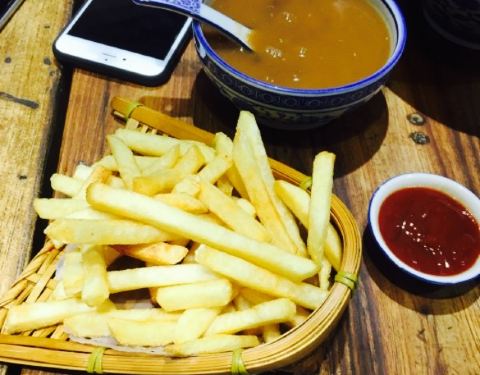 很美味的小面,虽说有一些小插曲让我没有吃完这碗面,不过老板娘和老板娘一看就是好人,味道跟我在成都吃的没两样,薯条炸的也很鲜美,不输西餐厅30多一盘的。维维豆奶不好喝,建议还是选唯怡豆奶来卖,适口度比较高一点。