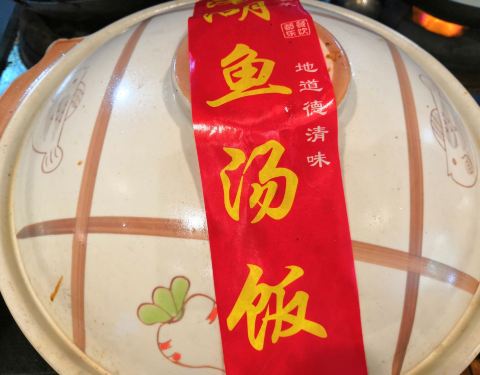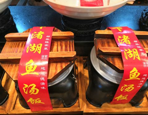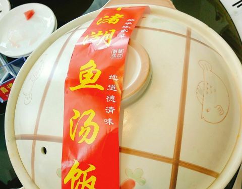 和朋友来德清玩,中午搜附近搜到这家店,招牌鱼汤饭挺吸引人的,就在这边吃了。明档点菜,一目了然,鱼汤饭好有仪式感啊,都是封着封条上桌揭的,特吉利。鱼头我是最爱了,分量也是真的足,吃完鱼头再把饭倒进汤...和朋友来德清玩,中午搜附近搜到这家店,招牌鱼汤饭挺吸引人的,就在这边吃了。明档点菜,一目了然,鱼汤饭好有仪式感啊,都是封着封条上桌揭的,特吉利。鱼头我是最爱了,分量也是真的足,吃完鱼头再把饭倒进汤里,超级鲜美。我们人不多,一个鱼汤饭加几个蔬菜就足够了,喜欢这个芋头,很酥嫩软糯入味