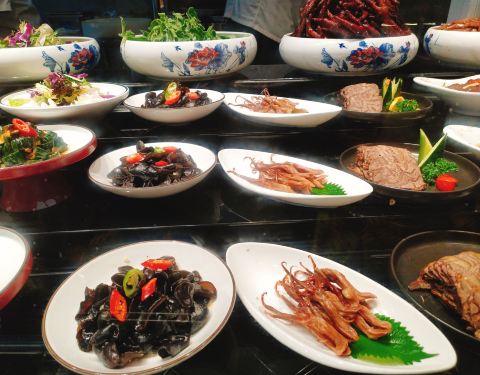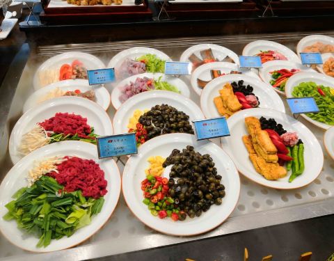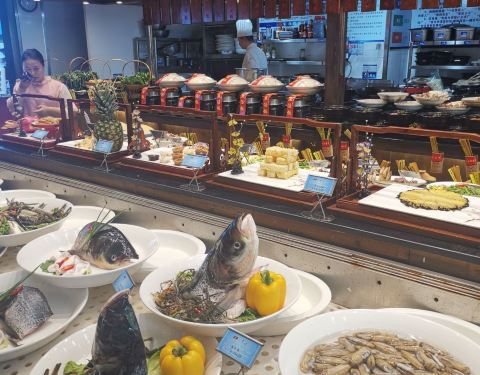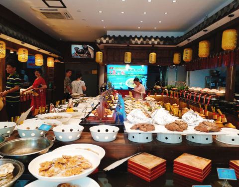 从杭州过来开车不到一小时就到了,交通很便利,城市绿化特别好,饭店对面还有一个好大的免费公园,逛了一个多小时才逛了一半不到。一楼的大厅摆满了一排排待加工的美味佳肴,看上去太诱人了,特别喜庆。2楼装修得...