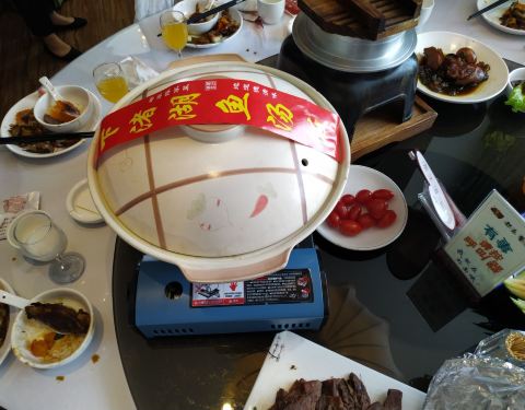 德清的朋友带我来的一家店,说是地道的德清菜,老底子味道。到店的时候正是饭点,人还挺多的,生意很好的样子。 点了她家最有名的招牌鱼汤饭,不知道是不是学的谭鸭血,一锅鱼汤一锅香米饭,开盖的时候还要说几句...