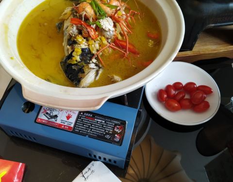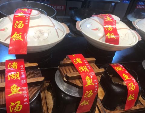 和朋友来德清玩,中午搜附近搜到这家店,招牌鱼汤饭挺吸引人的,就在这边吃了。明档点菜,一目了然,鱼汤饭好有仪式感啊,都是封着封条上桌揭的,特吉利。鱼头我是最爱了,分量也是真的足,吃完鱼头再把饭倒进汤...
