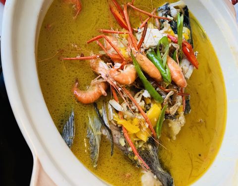 和朋友来德清玩,中午搜附近搜到这家店,招牌鱼汤饭挺吸引人的,就在这边吃了。明档点菜,一目了然,鱼汤饭好有仪式感啊,都是封着封条上桌揭的,特吉利。鱼头我是最爱了,分量也是真的足,吃完鱼头再把饭倒进汤里,超级鲜美。我们人不多,一个鱼汤饭加几个蔬菜就足够了,喜欢这个芋头,很酥嫩软糯入味