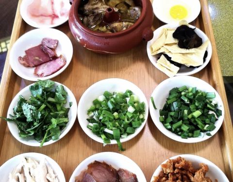配料不多、但是选材很好,生鱼片、汽锅鸡、火腿片、鸡肉丝、香酥、韭菜、葱花、芫荽、木耳、豆皮、鹌...