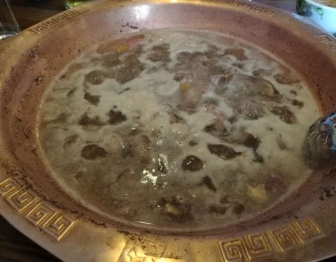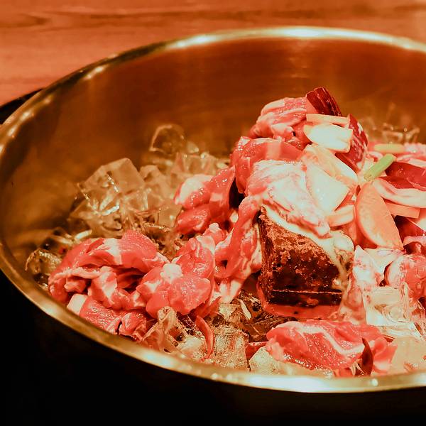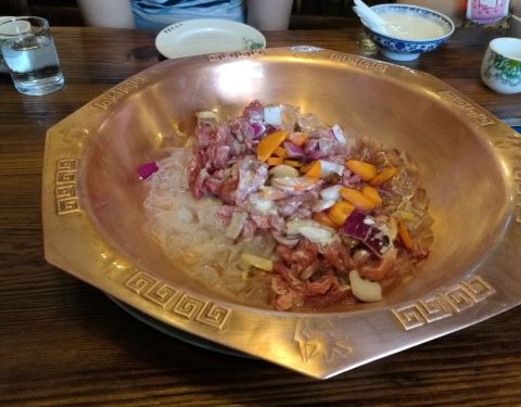 一般的网红店都让我失望,但这家店可是真正的网红店。《亲爱的客栈》刘涛一行人就在这里吃的,到了寒冷的地方必须来吃顿火锅。这家火锅的特色是用冰煮羊,用 阿尔山 地下碱性水制作冰托底,加入红酒、酸奶等各种调料,选用上好的羊肉切成块,放入锅中低温煮熟很嫩且久煮不老,真的是很好吃的美味,于是我的美食日记上又收藏了一种火锅的新吃法。