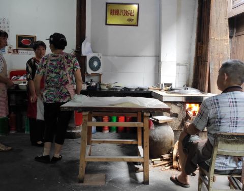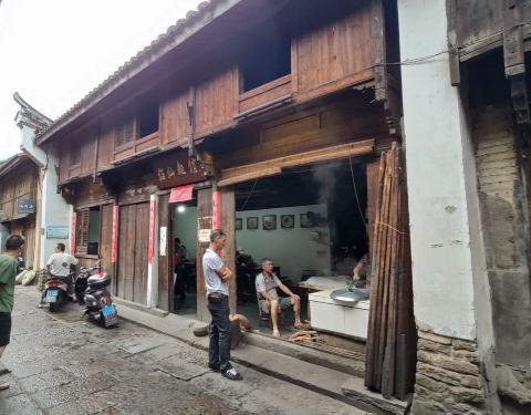 行走在松阳老街上,这家面馆一定不能错过!人气颇旺的佰仙面馆依然保留着几十年前的灶头和店铺格局。一家人分工合作,烧柴、揉面、煮面、放浇头,整套流程下来,配合默契。从侧面来看,像是一副充满烟火气的油画。这里的面条叫做水牵面,面条筋道又软滑,配上店里特色的浇头,吃完再把汤喝掉,真的是再幸福不过了。大排面、大肠面是店里的特色面,来老街非常值得一尝!老街上还有出售各种小吃如煨盐鸡、碱水粽等,但基本上都是仅此一家,如果看到抓紧买,说不一定再回头过来店就已经关门啦!