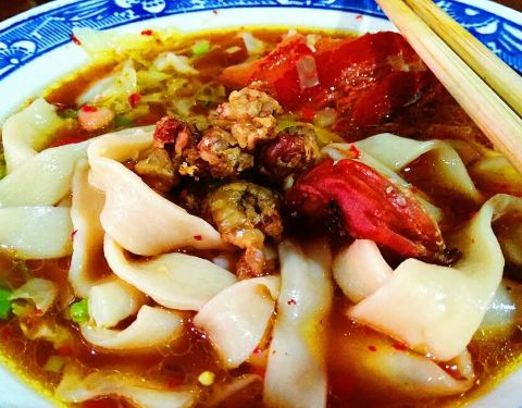 手工面,用的是柴火烧的哦,红色的酒糟大肠,还有油渣,很香,百年老店