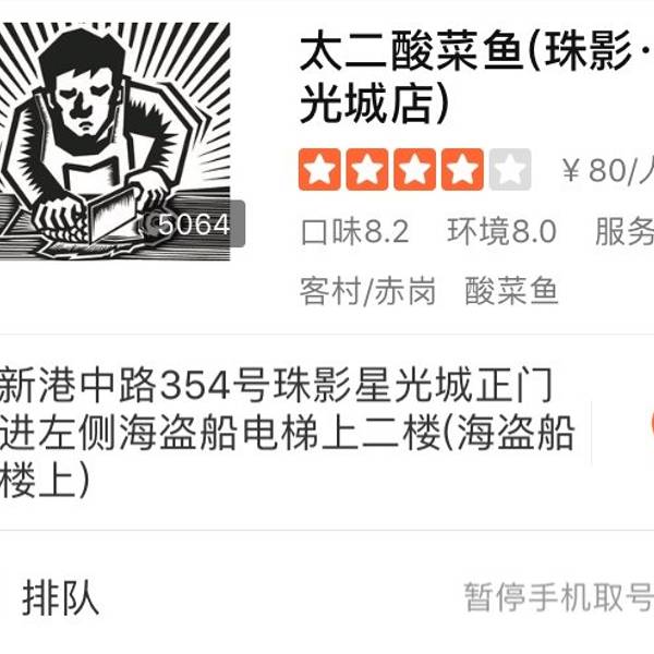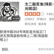 太二,那时候厦门万象城开业的时候火爆程度已经见识过了,要吃一顿很不容易。上半年来广州出差的时候知道这里也有太二,问了当地的朋友说珠影星光城那边有店,于是就一起坐地铁过去,很便捷。 大中午的...太二,那时候厦门万象城开业的时候火爆程度已经见识过了,要吃一顿很不容易。上半年来广州出差的时候知道这里也有太二,问了当地的朋友说珠影星光城那边有店,于是就一起坐地铁过去,很便捷。 大中午的时候过去虽然也要等位但是只等20分种是可以接受的,餐厅的座位也比较多。菜品应该是差不多的,所以点的菜是和同事一起去吃的时候来点的,反正朋友没吃过。有招牌老坛子酸菜鱼、糍粑、没骨头鸡爪,还有米饭。朋友感慨酸菜真的比鱼好吃,当然把鱼也都吃的差不多了,剔了骨的鸡爪很入味,辣的过瘾,搭配糍粑刚好解解辣,花茶也很不错,陈皮&洛神花,不知道是不是多喝了两杯感觉胃口挺不错的啊。