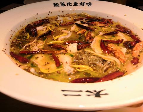 太二可以说是非常任性的,“酸菜鱼不加辣也不减辣”,“一桌最多四人就餐,不拼桌也不加位”,主菜只有一道酸菜鲈鱼,别看上面铺了一层红艳艳的辣椒,害怕会辣到飞起,实际上真的不辣!鱼片好滑嫩,没有小刺,吃...太二可以说是非常任性的,“酸菜鱼不加辣也不减辣”,“一桌最多四人就餐,不拼桌也不加位”,主菜只有一道酸菜鲈鱼,别看上面铺了一层红艳艳的辣椒,害怕会辣到飞起,实际上真的不辣!鱼片好滑嫩,没有小刺,吃起来特别爽。他们店还有一句口号“酸菜比鱼好吃”,个人觉得里面的酸菜和酸萝卜有点酸,还是鱼更好吃。