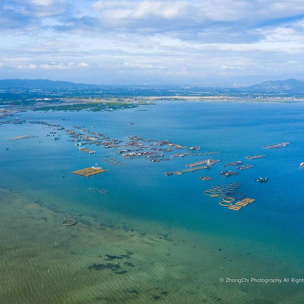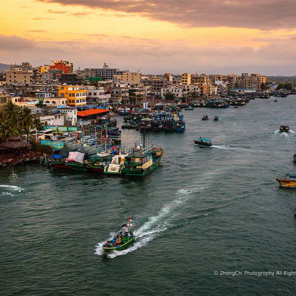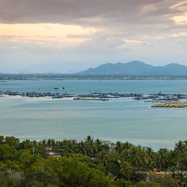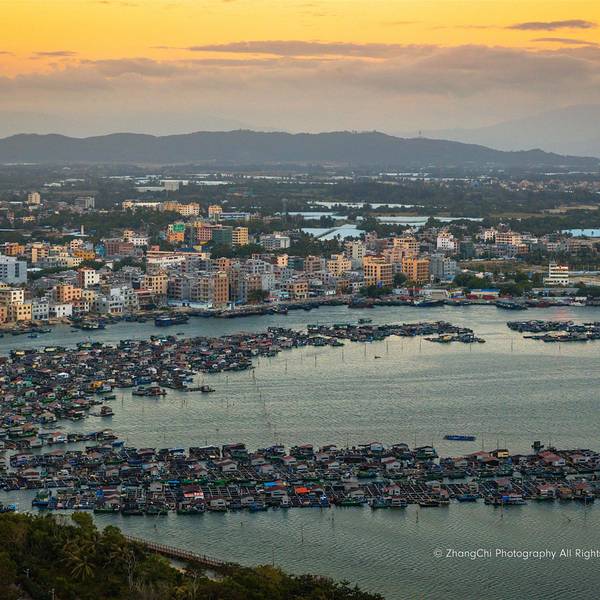 传说古代皇帝出海时把珍宝掉入海中,派渔民打捞未果,便禁止让他们上岸,于是他们只得把房屋盖在船上,以船为家、依海而生、随水而动。这是疍家人来历的一个传说,主要分布于海南、福建、广东、广西这些沿海地区,因为他们常年漂泊在海上,在岸上没有田地也没有户籍,所以也被称为“海上吉普赛人”,直到新中国成立之后,疍家人才逐渐回到岸上定居的生活。清光绪《崖州志》记载:“疍民,世居大蛋港、保平港、望楼港濒海诸处。男女罕事农桑,惟辑麻为网罟,以鱼为生。”就在南湾半岛的海湾之间,新港村就是著名的疍家渔排,他们的祖先大约五百年前就来到了这里。我并没有坐船进入这些渔排之中,乘坐猴岛的观光缆车便可以从空中的视角一览疍家渔排的壮观。疍家渔民用泡沫和木板在海面上盖起房子,以船为车穿行在水路之上,犹如“海上街市”。海中那一块一块的网箱,则是休渔期用来养殖从深海捕捞来的鱼群。