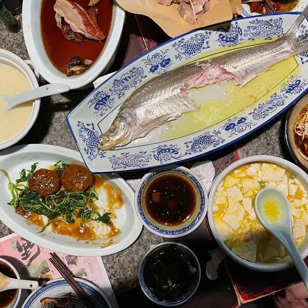 南京大排档还是那个排大长龙的大排档。我们从家出发前,就先打电话问能不能提前拿号,服务员说不行,然后我们家的两宝。先行去取号了,因为他们住得很近,于是我们到店时正好排到我们,时间正正好好。(心想:嗯~看来今天就该吃啊😁) 怀着愉悦的心情入座点餐,其实他家真的,每道菜闭眼入,都没问题。来之前,我们的饮食大概清淡了两周,所以点得有点“刹不住脚”,最后打包了六七个菜。实在是吃到扶墙出…… 老牌阳春面:点它姐妹们! 简简单单的阳春面,怎么会那么好吃?汤头很鲜,但绝不是人工添加剂的鲜,是自自然然的鲜,是不露声色的鲜,细面的柔滑,真是我们江南面食的最大特色了,软硬适中,火候正好,真想痛痛快快地吸溜出声音但大庭广众还是“矜持”了下下……我们四个人分一分,清盘,连汤带面! 鱼鸡汁白鱼: 虽然是我和爸爸俩海鲜杀手的最爱,但另一位平时总是怕腥的人都动筷子了,边吃边夸:嗯!真的好鲜!好好吃!然后,三人清盘(另一位从不吃鱼的不计入内鱼肉绝对新鲜,肉质格外鲜美,咸、甜平衡度极好,而且我感觉……是稍微腌制过的?有些部位的质感非常有“力量”哈哈哈抱歉我词穷了,你得去吃才知道!点它,姐妹们!