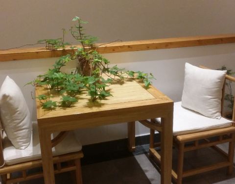 去普陀山还愿进香,中午想吃素的,搜到开了枣子树,于是下了佛顶山就找过去。结果发现公交车站下来还要走好多路,太阳下走这一段实在是痛苦。如果你体力不够好或者怕热,就不要特地去吃了。 好不容易到了地方,所幸环境优雅清净,空调又给力,人也少,服务员比较热情。点了一桌素菜,最好吃的是藕夹、香肠、腐衣还有常相思(就是菌菇),爸妈表示香肠做得很像肉。但是作为吃过上海枣子树的人,我表示这家菜单上东西少了很多,尤其是炒面非常不好吃,建议不要点。