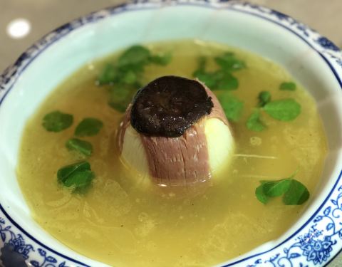 - 还有一道特别考验刀功的煮干丝也是我个人比较喜欢吃的,干丝切的丝丝分明,笋丝,火腿丝,高汤喂出来...
