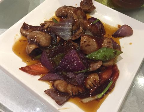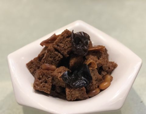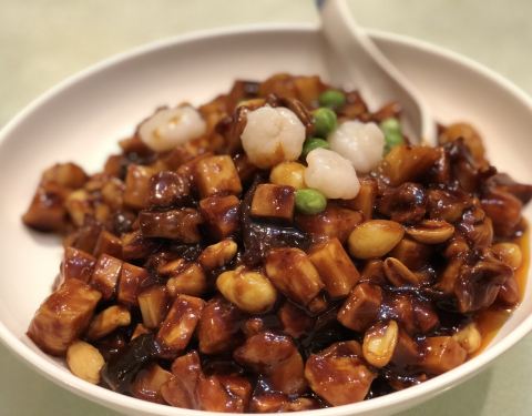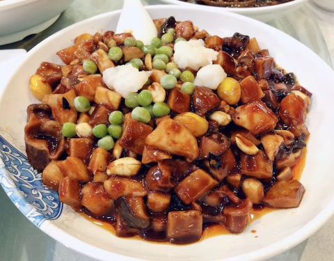 ...,香脆的花生米,清脆的鲜笋,还有鸡胗,肉丝等等,口味略偏甜,非常好吃,如果下饭吃绝对是要加饭的