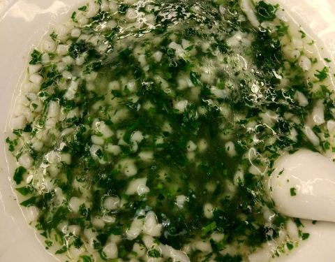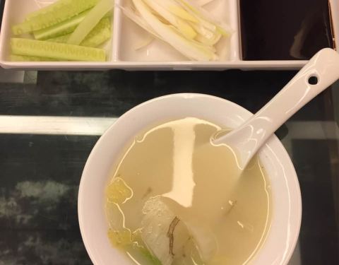 鸭汤浓稠,鸭子香酥油而不腻,沾上酱料,配上大葱及小黄瓜条吃香浓咸淡适口。