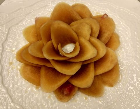 - 但现烤现片的非常好吃,尤其是鸭胸那部分的酥皮,酥嫩可口,蘸点糖,完美! 紫薯山药泥,健康又美味的前菜