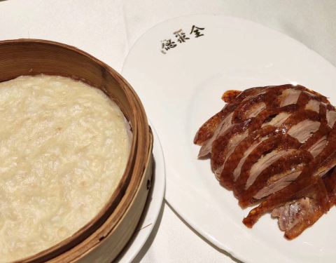 全聚德是我很喜欢的店,谁让我喜欢吃烤鸭呢。北京的全聚德给我印像最深的是服务很到位。上海火车站附近的全聚德除了烤鸭,让我印象最深的是一到叫木桶群鲜宝的餐品,不过是好多好多年前的事了,不晓得这道菜还保...全聚德是我很喜欢的店,谁让我喜欢吃烤鸭呢。北京的全聚德给我印像最深的是服务很到位。上海火车站附近的全聚德除了烤鸭,让我印象最深的是一到叫木桶群鲜宝的餐品,不过是好多好多年前的事了,不晓得这道菜还保留着吗?至少淮海路这家没有。疫情期间都不敢在外面吃饭,昨天是来淮海路取戒子所以才破例一次,晚上的上座率只有三四成。点了半只烤鸭,也是现场片皮。半只鸭子木油鸭架,所以也就不用纠结做椒盐还是弄汤啦。鸭皮的口感还是有保证的,酥酥脆脆,满嘴留香。鲜榨果汁统统没有,所以就老老实实和白开水了,最近长了好几斤,碳酸饮料能免还是要免滴。