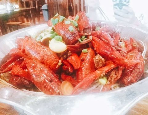 油焖大虾 不错 处理很干净 去了虾线去头,底下铺满绿豆芽 和黄瓜,凉拌鱼腥草也好吃 目前活动是...
