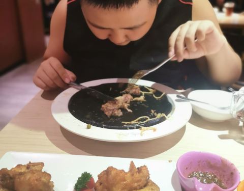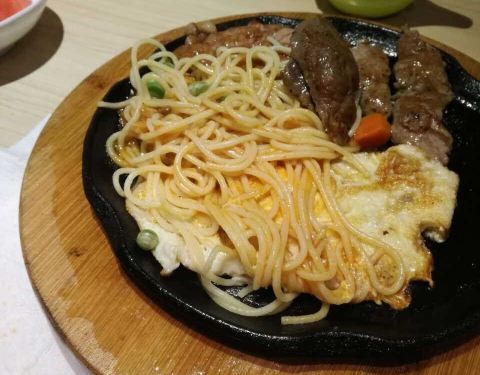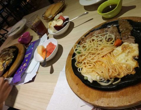 ...好吃,还有玉米汤都超级好喝,点的两人餐,我跟儿子都吃充了,餐后水果也是够新鲜,不错不错值得推荐
