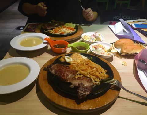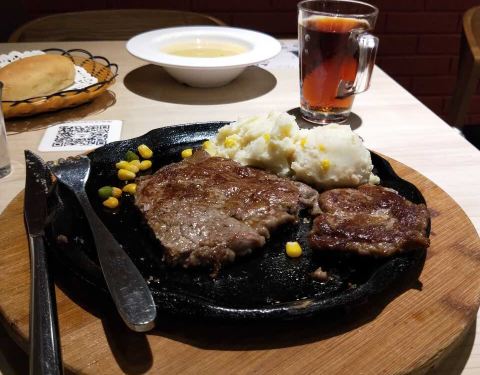 豪客来,几乎是最早的牛排连锁品牌,开了有20年了吧。以前觉得它很高端,在餐饮界蓬勃发展的现在,反倒觉得它越来越平价和亲民了。 这家位于夏商钟楼生活广场。店里位置多,挺宽敞。服务也不错。 自助沙拉台种类不少,也算新鲜。 双人牛排套餐,有两份牛排,玉米浓汤、餐包,美国酸奶薯条,还有一杯西米奶茶。性价比还真是挺高。