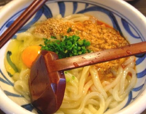 釜玉坦々うどんにトライ。うまし。相方が食べてたかしわを1コもらって食べる。かしわのうまさヤバいレベル