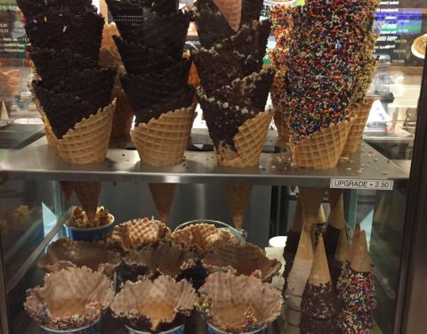 经过时被他们的雪糕筒吸引着,五颜六色占了碎巧克力的或整个有一层厚巧克力的,很有吸引力力。雪糕的味道虽然不多,但可见试吃,满意才购买。