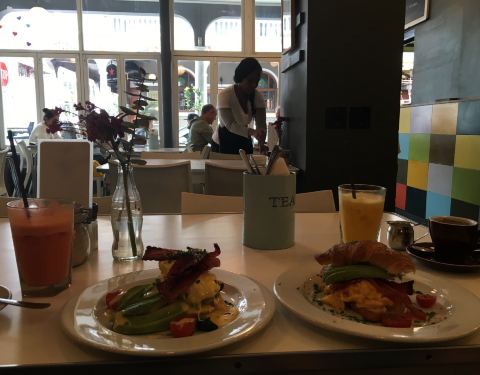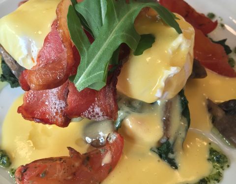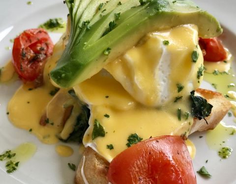 The Eggs Benedict are fabulous. They come with either mushrooms or bacon but you can ask for avocado instead.