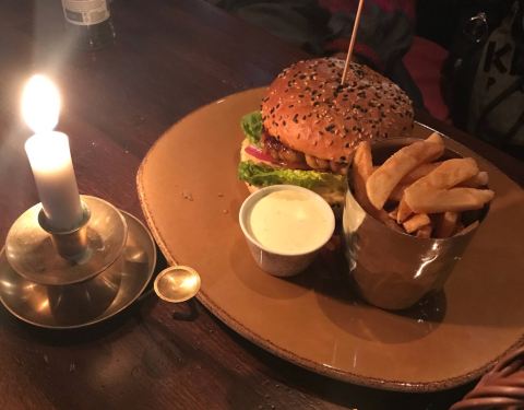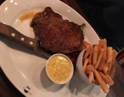 这家餐厅的内部空间不大,提供快餐牛排,口味很好。