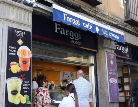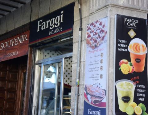 farggi是一个连锁的咖啡馆品牌,西班牙很多城市都有,这家在塞戈维亚罗马渡槽下,很明显。店不算大,出售咖啡,冰激凌,果汁,面包等。