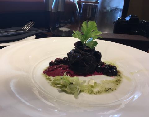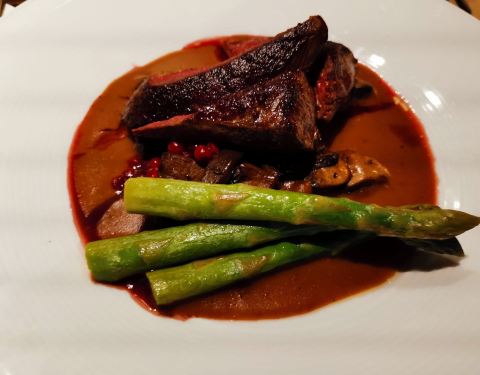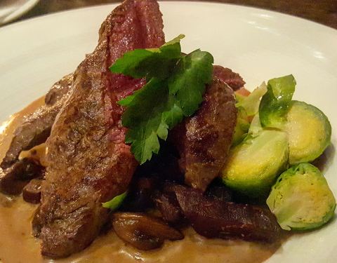 The Reindeer Filet was so tender, delicious, and prepared perfectly! It's served with a creamy mushroom sauce and Brussels sprouts.
