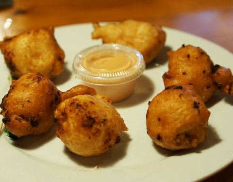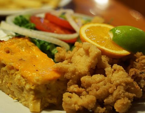 这是拿骚的一家快餐店,基本都是油炸海鲜,热量非常的高,不过味道还是很不错的。墨鱼丸加上调制的酱料一起在油里炸到金黄,口感Q弹十分的好吃,冰淇淋也味道不错,香甜味浓和。好吃。